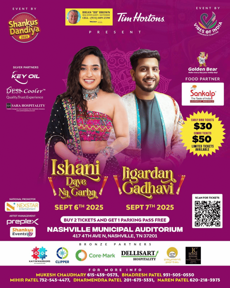 Nashville lights up with festive colors as the city celebrates Navratri on Sept 6 and 7. From traditional raas-garba circles to a buzzing community vibe, each night offers a unique blend of culture, joy, and Gujarati pride.